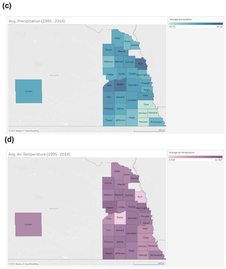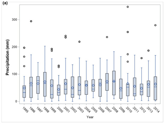 Precipitation and temperature trends between 1995 and 2014 were characterized in Figure 5a,b, respectively. The observed counties seem to record lower precipitation in 1995, 2000, and 2012, Figure 5a.