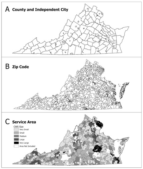 Comparison of Virginia (A) county and independent cities (n = 134), (B) zip codes (n = 886), and (C) this study’s results for community water system (CWS) service areas (n = 662) at the zip code scale by CWS size. Note: Some service areas overlap, obscuring a full view of all delineated service areas. Geographies not included in a service area do not imply that there is no service from CWSs but were excluded due to systems that previously could not be geocoded. All geographies are from the 2000 US Census Tiger shapefiles.