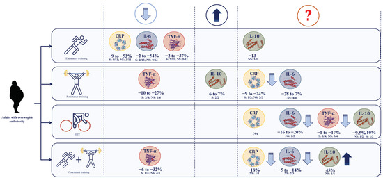 - Ho, S.S.; Dhaliwal, S.S.; Hills, A.P.; Pal, S. Effects of chronic exercise training on inflammatory markers in Australian overweight and obese individuals in a randomized controlled trial. Inflammation 2013, 36, 625–632. [Google Scholar] [CrossRef]