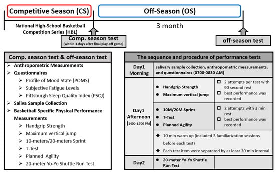The purpose of this study was to investigate the periodic changes in sport performance, biomarkers, mood state, and sleep quality in elite high-school basketball athletes. Therefore, the present study design was observational in nature, with no control group. Elite male adolescent Division I high school basketball players were recruited in this study, and our study design is to observe the changes of salivary stress-related hormonal response, mood states, sleep quality, and basketball-specific physical performance between the competitive season (CS) and off-season (OS) periods in elite adolescent basketball players. This study was approved by the Institutional Review Board (IRB) of National Yang Ming University (protocol#: YM105088F) and performed following the current Declaration of Helsinki.