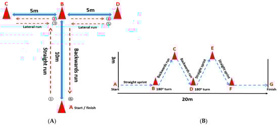 The procedure of the measurements at the competitive season and off-season. (A) The T-Test. (B) The planned agility test. The A → D and A → G represent the triangular cones used in the path of the T-Test and the planned agility test, respectively.