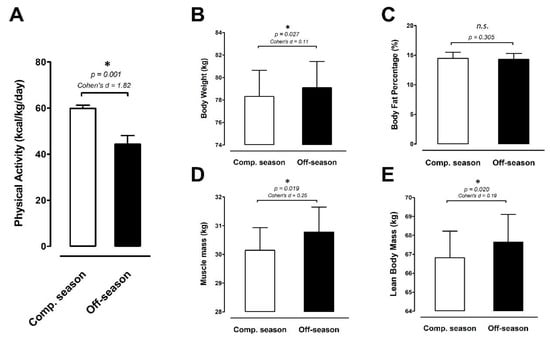 Physical activity and body composition. (A) Physical activity, (B) body weight, (C) body fat percentage, (D) muscle mass, and (E) lean body mass were measured at the competitive season and off-season (competitive season, open bar; off-season, black bar). Data are expressed as Mean ± S.E.M. * denotes significant difference between two phases (p < 0.05). Comp. season: competitive season (CS), off-season (OS).