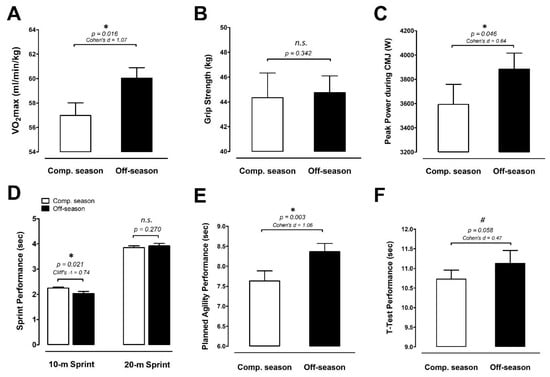 Basketball-specific physical performance. (A) VO2max, (B) grip strength, (C) Abalakov jump (AJ) peak power, (D) sprint performance, (E) basketball-specific planned and reactive performance, and (F) T-Test performance was measured at the competitive season and off-season (competitive season, open bar; off-season, black bar). Data are expressed as mean ± S.E.M. * denotes significant difference between two phases (p < 0.05). Comp. season: competitive season (CS), off-season (OS). # denotes approached significance (p < 0.075)