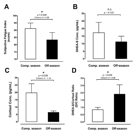 Figure 5A displays subjective fatigue levels. The subjective fatigue level was significantly lower during the off-season period than during the competitive season (−8.5%; ES 0.58; p = 0.046). The salivary DHEA-S levels are shown in Figure 5B. There was no difference in DHEA-S between the competitive season and off-season periods. Conversely, the salivary cortisol level was significantly lower during the off-season period compared with the competitive season (–67.4%; ES 1.14; p = 0.036; Figure 5C). Furthermore, the DHEA-S-to-cortisol ratio (D/C ratio) is illustrated in Figure 5D. During the off-season, the D/C ratio rose significantly by approximately ≈127.5% above the competitive preparation season level (D/C ratio: ES 0.86; p = 0.039).
