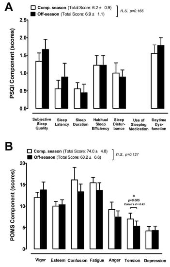 Sleep quality and habitual sleep have been reported to decrease in adolescent populations [46]. In this regard, coaches should make adolescent student–athletes aware of the effects of insufficient sleep on their overall development [47]. The literature shows that chronic sleep deprivation can impair long-term athletic and academic achievement and may result in increased risks for serious pathophysiologies, illness, sport injuries, and other health-related issues among this population [13,48]. In this study, we found that the PSQI scores of two different phases presented with bad sleep quality (the score of PSQI > 5), but there was no difference between the competitive season and off-season in the sub-elements of PSQI, including sleep quality, sleep latency, sleep duration, habitual sleep efficiency, sleep disturbance, and daytime dysfunction (Figure 6A). Although bad mood states were associated with poor sleep quality in elite athletes [49], such a pattern was not observed in this present investigation. These athletes experienced poor sleep quality (PSQI > 5) across both training/competition periods, which might create a ceiling effect on the perturbations in mood states.