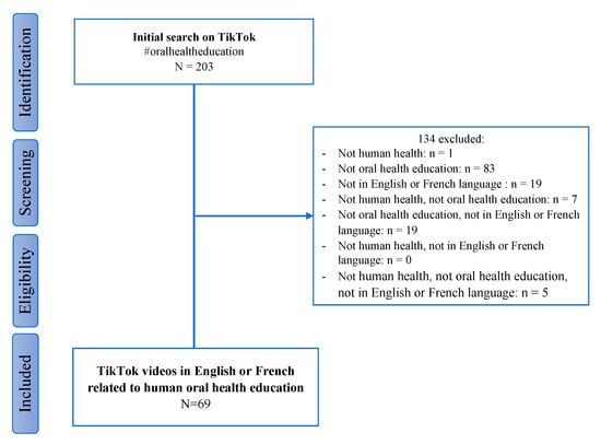 A total of 203 TikTok videos were extracted with the hashtag #oralhealtheducation, which was associated with 6.8 million views on 28 September 2021 (Figure 1). Next, two university researchers (LF, FC) selected the videos. Videos were included if they (i) focused on human health, (ii) contained an educational or preventive message, advertising content, or commercial advice related to oral health, (iii) were in the French or English language. TikTok videos related to animal health, surgery, therapeutic or orthodontic treatment, piercing or tooth carving were excluded. After watching all the videos, 69 videos met the inclusion criteria and were selected for the evaluation study, representing 34%.