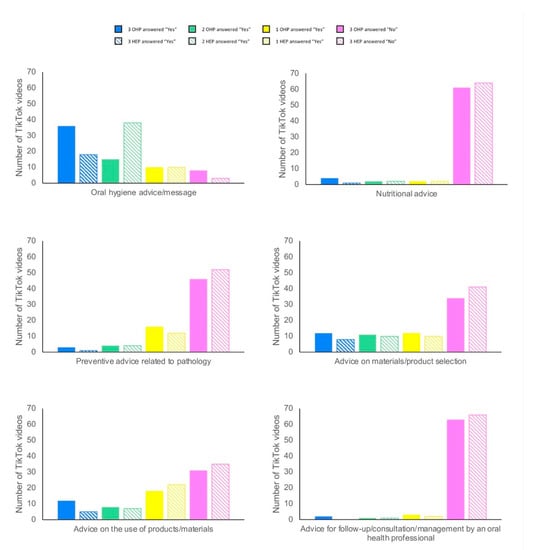 The OHP and HEP agreed to concerning the three main objectives of the TikTok videos corresponding to #oralhealtheducation (Figure 2). The first goal of the studied videos was to provide oral hygiene advice or message (36/69, 52.2% of videos according to OHP; 21/69, 30.4% of videos according to HEP). The second one was to provide advice on materials/product selection (12/69, 17.4% of videos according to OHP; 8/69, 11.6% of videos according to HEP). And the third one was to provide advice on the use of products and/or materials (12/69, 17.4% of videos according to OHP; 5/69, 7.2% of videos according to HEP). The advice concerning the follow-up, the consultation, and the management was the objective of only two videos (2.9%) according to OHP and of no video according to HEP.