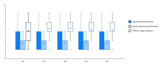 Subjective evaluation of TikTok videos corresponding to #oralhealtheducation. The Boxplot representing the quotation for question E.1 to E.5. E.1: Do you think the video is attractive?; E.2: Do you think the video is likely to increase awareness of the importance of oral health?; E.3: Do you think that video is likely to provide relevant information related to oral health?; E.4: Do you think the video is likely to change oral hygiene habits?; E.5: Overall score for the video.