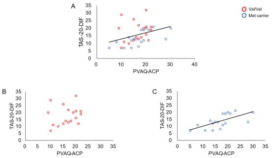 Correlation between the scores of the 20-item Toronto Alexithymia Scale—an index of difficulty identifying feelings—and the pain vigilance and awareness questionnaire—an index of attention to changes in pain. (A) Correlation in all participants. (B) Correlation in the Val/Val group. (C) Correlation in the Met-carrier group. Red and blue circles indicate the data of Val/Val participants and Met carriers, respectively.