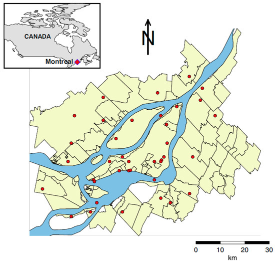 Montreal metropolitan community (Canada). Red dots are the meteorological stations used for measuring meteorological variables.