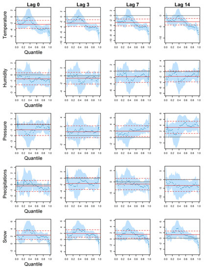 An inverse association between hospitalizations and humidity is observed at every lag (negative estimated coefficients), except in peaks at lags 3, 7, and 14. However, coefficients are mostly non-significant. There are some exceptions, such as lags 7 and 14, around the median. For peaks (higher than the 95% quantile) at lag 7, the humidity effect is significant with negative estimated coefficients. In this case, a classical regression finds a non-significant effect, whereas there could be a significant one in the peaks. Overall, classical regression coefficients are not significantly different from QR coefficients.