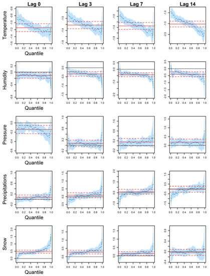 Precipitation effects were mainly non-significant on CVD deaths and hospitalizations. Some quantiles for hospitalizations (at every lag) revealed significant negative coefficients, which means that an increase in precipitations was associated with a decrease in hospitalizations. However, this effect was non-significant in the peaks. As with the other meteorological variables, this heterogeneous impact would not be revealed using a classical regression. To the best of our knowledge, though some studies link health conditions to precipitations (such as hydric diseases [58]), no study has focused on CVDs. As with humidity, precipitations are rarely investigated alone when studying health impacts, more frequently with temperature or snow height [59,60].