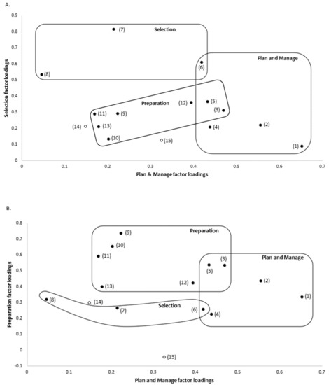 Two-dimensional plots of the three food literacy behavior factors. (A) Plan and Manage (x axis) and Selection (y axis) factor loadings. (B) Plan and Manage (x axis) and Preparation (y axis) factor loadings. The three food literacy behavior factors are indicated on the graphs, with questions scoring ≥ 0.4 indicated. Unfilled points indicate questions that did not significantly load on any factor.