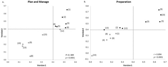 Comparison of factor loadings in food literacy behavior tools of those questions common to both questionnaires. (A) Plan and manage factor; (B) Preparation factor. x axis: original food literacy behavior tool based on Version 1 of the questionnaire. y axis: revised food literacy behavior tool from Version 2 of questionnaire. The dashed line indicates 0.4 cut-off used. Filled in points indicate factor loading ≥ 0.4 in analysis of questionnaire Version 2.