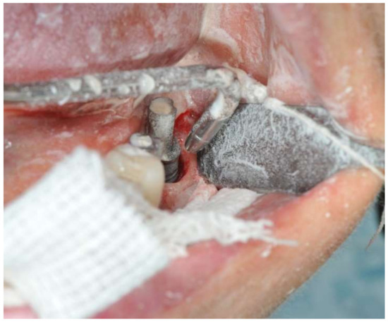 A 65-year-old woman with a noncontributory medical history was referred to the Oral Surgery Unit, Policlinico Umberto I, “Sapienza” University of Rome, Italy, to undergo surgical reconstructive therapy peri-implantitis lesion localized around the mandibular left distal implant (Figure 1 and Figure 2). The patient’s written detailed informed consent was obtained for the diagnostic and therapeutic approach and the use of the documentation for research purposes and publishing.