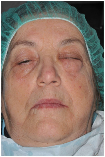 During open-flap debridement of the infected implant surface with sodium bicarbonate air powder abrasion (PROPHYflex™ 3 with periotip, KaVo, Biberach, Germany) (Figure 3), rapid onset swelling arose on the left cheek as well as in the periorbital space. The procedure was stopped immediately and the surgical area was rinsed with sterile saline solution to remove all residual bicarbonate particles. Before repositioning and suturing the flap, intra- and extra-oral inspection and palpation of the face and neck were performed to determine the spread and extension of entrapped air. Extra-oral examination revealed slight asymmetry of the face and complete left eyelid ptosis due to swelling of the left periorbital space and cheek (Figure 4).