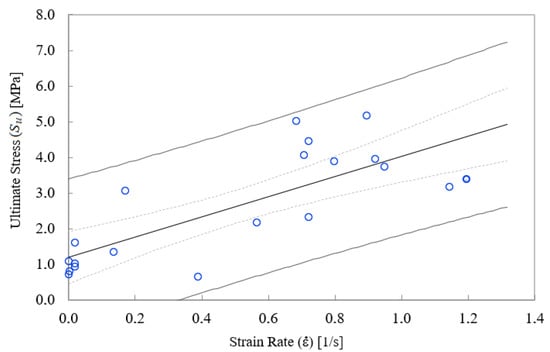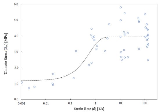 For low strain rate, the analysis of empirical data for ultimate stress shows a significant increasing trend (p < 0.001) of this magnitude with strain rate (see Figure 1). The data from Monea et al. also show such an increasing trend [], although in the range studied s the effect of strain rate does not reach to be significant. This suggests that there is a significant increase in for low strain rate, but that effect is “saturated” for values of the strain rate s, as shows Figure 2.