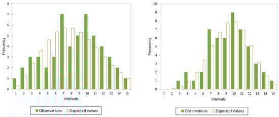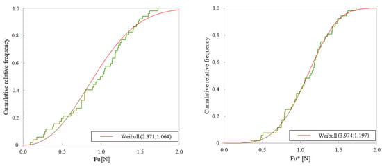 where the fitted values for the parameters are: [N] for the scale parameter and for the shape parameter. The p-values obtained in the goodness-of-fit tests to a Weibull distribution were high, corroborating that the Weibull distribution can adequately represent the data: for the Kolmogorov–Smirnov test the p-value was 0.962 and for the chi-squared test () the p-value was 0.958. Figure 4 shows the form of the CDFs for and for . The CDF for coincides with Equation (8).