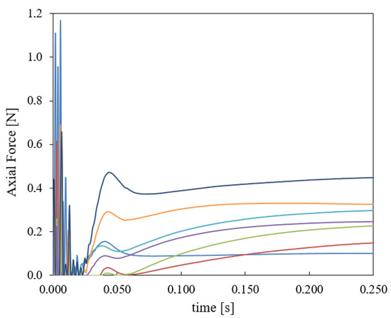 Axial Forces on the CBVs of the SIMon model (FEHM), computed for the described fall from a height of 2.5 m against a ground of ballast stiffness . One line is presented for each pair of CBVs of the FEHM. Each color line represents a different CBV, the forces differ because the CBVs are located in different parts of the brain.