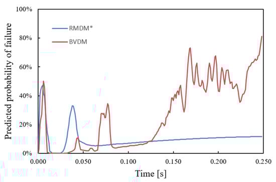 From Figure 5, we see that initially, when the head hits the ground, the largest forces are registered, and the elastic compresive waves shake the brain mass inside the skull walls. Regarding the comparison between RMDM and BVDM, in the initial phase, up to 0.25 ms (see Figure 5), the RMDM and BVDM predictions run almost parallel and the maximum ASDH probabilities reach 47.5% and 50.0%. During the next phase, where the head rebounds from the ground, the brain mass is compressed and the CBVs together with the skull stretch it. In this phase the force of the most requested CBV is 40% of the value in the initial phase, and the strain rate is considerably lower, and the RMDM and the BVDM differ markedly, since they treat the strain rate effect in a different way: the Löwenhielm-Takhounts failure function, inside Equation (1) and the SRDF inside Equation (7) differ considerably. Due to this, the risk predicted by RMDM, when the strain rate is low for s, is considerably smaller than the risk predicted by BVDM.