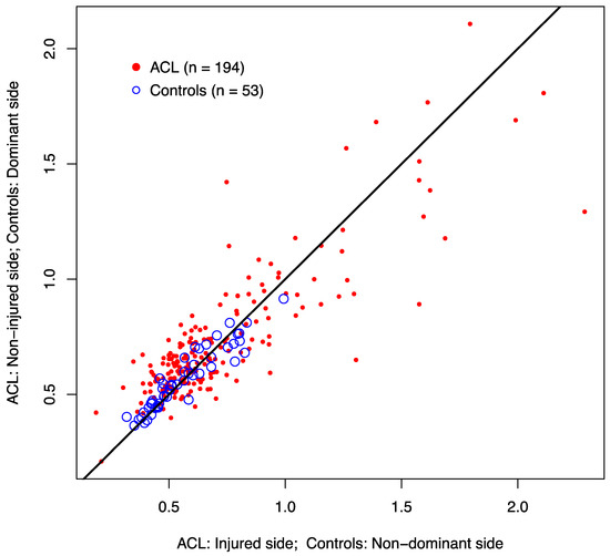 Figure 1 shows the simultaneous scatter plot of the H/Q ratio for the two sides; namely, for the patients (injured versus non-injured side) and for the controls (dominant versus non-dominant side). For the controls, the estimated ICC was 0.932 (95% CI = 0.886–0.969), indicating strong agreement between the values of both sides. However, this agreement was lower between the injured and non-injured sides in the patients (ICC = 0.834; 95% CI = 0.786–0.872).