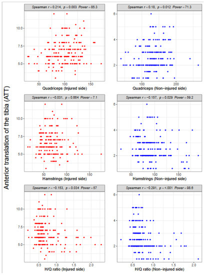 Hamstrings strength was significantly correlated (negatively) with ATT on the non-injured side (Spearman R = −0.157, p = 0.029) but not on the injured side (Spearman R = −0.031, p = 0.664; Figure 2). The H/Q ratio was significantly (negatively) correlated with ATT on the injured and non-injured sides (Spearman R = −0.153, p = 0.034 vs. −0.291, p < 0.001; Figure 2).