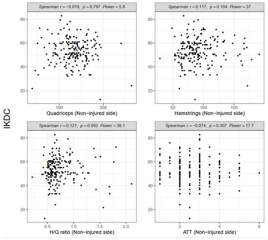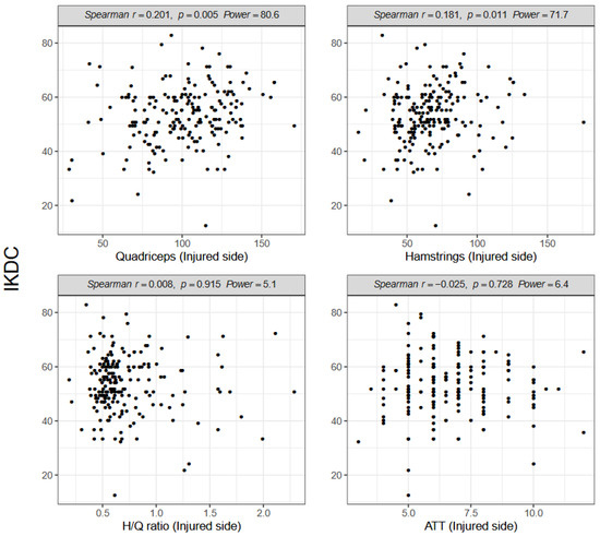 Quadriceps and hamstrings strength of the injured side was significantly correlated with the IKDC score (Spearman R = 0.201, p = 0.005 vs. 0.181, p = 0.011; Figure 3).