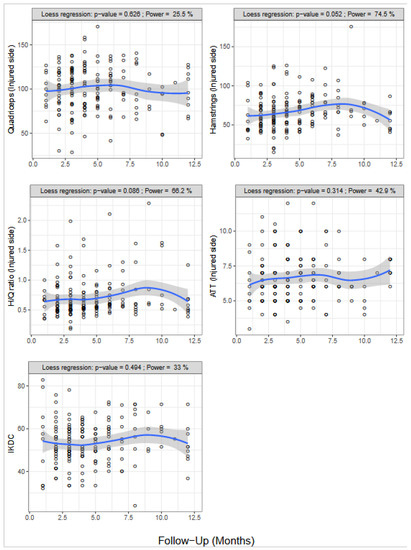 Muscle strength, the hamstring/quadriceps (H/Q) ratio, and International Knee Documentation Committee (IKDC) score according to the time post-injury (months). Data smoothing was performed using the LOESS function.