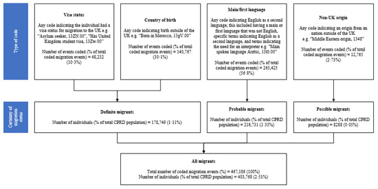 We searched for Read V2 terms relating to international migration using the following: *migrant*, *migrat*, *countr*, *asylum*, *refugee*, *visa*, *abroad*, *born in*, *origin*, *illegal*, *language*, with the asterisk representing a wildcard search operator. The initial list of terms was reviewed and refined by two experts in migration health research. Each term was assigned a category (Figure 1) based on the type of term (“visa status indicating migration to the UK”, “main/first language not English”, “country of birth outside of the UK”, “non-UK origin”) and a category based on the certainty of migration status (“definite”, “probable”, “possible”). Each individual was classified once using their highest certainty of migration category.