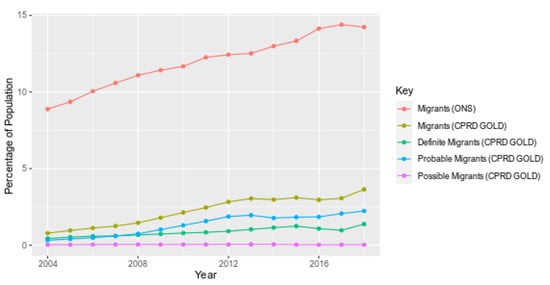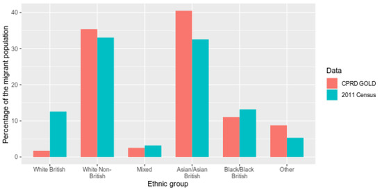 The following are available online at https://www.mdpi.com/article/10.3390/ijerph182413304/s1, Table S1: Code list to create 18 categories of ethnicity, and a 6-category higher level grouping of ethnicity, Table S2: Migration phenotype, including Read (V2) codes, Read terms, Medcodes, type of code and level of certainty of migration status, Table S3: Number and percentage of recorded migrants in CPRD GOLD per year by certainty of migration status (1997–2018), Table S4: Demographic characteristics of recorded migrants in CPRD GOLD at the time of the 2011 census by certainty of migration status (England and Wales), Table S5: Migrants as a percentage of all patients registered in a CPRD GOLD practice region (2009–2018), Table S6: Percentage of individuals recorded as migrants in CPRD GOLD and ONS country of birth (2004–2018), Table S7: Percentage of CPRD patients recorded as migrants and ONS 2011 census percentage of migrants in the population by age band (2011), Table S8: Age breakdown of migrants in CPRD GOLD and in ONS at the time of the 2011 census, Table S9: Breakdown of migrants recorded in CPRD GOLD at the time of the ONS 2011 census by the 18 group classification of ethnicity (2011).