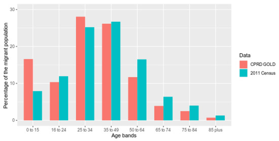 Comparing the whole migrant cohort within CPRD GOLD and ONS 2011 census data (Figure 4 and Table S8), differences are smallest across age bands between 16 and 49 years old, but greatest for the 0–15-year-old band and age bands above 50 years old. The proportion of females is similarly higher than males in both datasets (52.3% in CPRD and 51.6% in ONS).