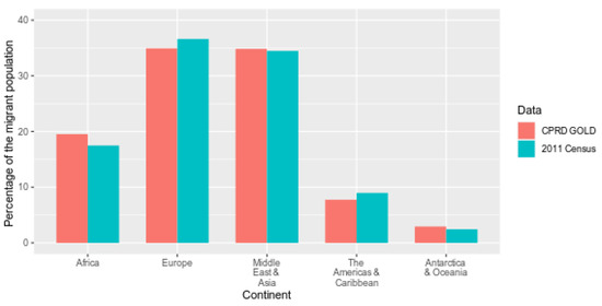 Percentage of migrants in CPRD (2011) and 2011 census according to continent of birth as defined by ONS Nomis.