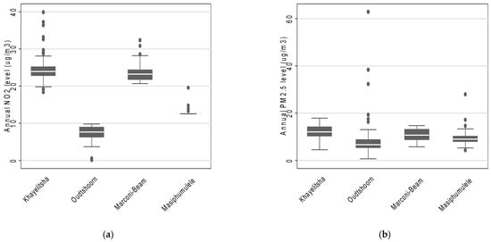 In comparison to previous studies within Africa, the estimated annual PM2.5 concentrations in this study were similar to those measured using stationary monitors in Zambia (10.2 µg/m3), while it was lower than measurements obtained in Zimbabwe (40.6 µg/m3), and in a previous study conducted in Bethlehem in South Africa (65 µg/m3) [24,25,26]. Moreover, the estimated annual NO2 levels in the current study were lower than levels measured in a previous study in Cape Town (25.1 µg/m3) [13].