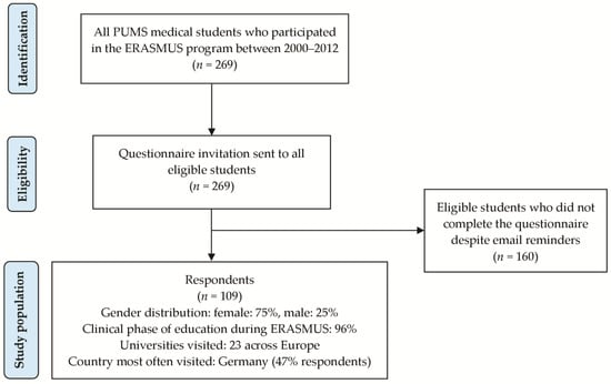 The period during which participants undertook the ERASMUS program lasted from 2000 to 2012, with increasing number of respondents towards more recent years of participation. Almost all respondents participated in ERASMUS during the clinical stage of education, and they visited one of 23 universities across Europe, with Germany as an unequivocal leader (47%), followed by France (9%), Spain (7%), the Netherlands (7%), Portugal (6%), Sweden (6%), Finland (6%), Hungary (5%), Turkey (3%), Italy (3%), Denmark (1%), and the Czech Republic (1%). The enrolment process was depicted in a flowchart (Figure 1).