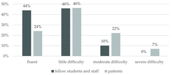 Additionally, 87% of the respondents indicated language as an important factor in choosing the ERASMUS destination, and 90% of them preferred to improve an already known language, with only 10% of the participants deciding to learn a new one. Although most students confirmed communicating with fellow students/academic staff and patients using the host country language (71% and 73%, respectively), communication with patients turned out to generate more difficulties (Figure 2).