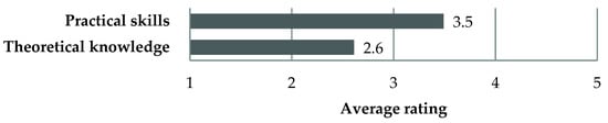 Interestingly, the participants (n = 102) assessed the practical skills of students from the host institution higher (3.5 ± 1.1 (median = 3)) on a 1–5 Likert scale, whereas the theoretical knowledge was assessed lower (2.6 ± 0.8 (median = 3)) in comparison with the competencies of Polish students. The difference in comparison between practical skills and theoretical knowledge was statistically significant (p < 0.001) (Figure 3).
