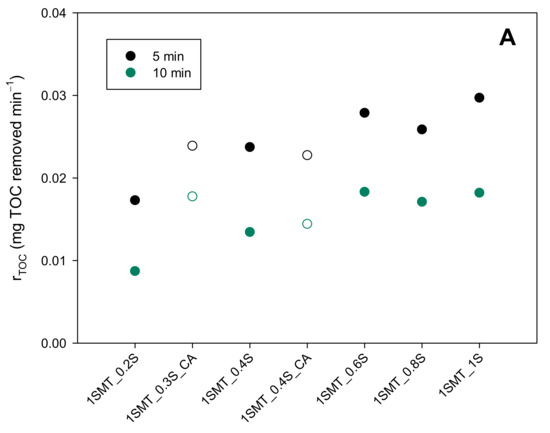 The process performance under different one-shot initial additions from 0.2S to 1S (126 mg L−1–631 mg L−1) was first evaluated (Figure 5A). Only the 1SMT_0.2S experiment presented a lower TOC reduction rate (mg L−1 min−1) than the rest of assays, which showed equivalent values. With respect to the H2O2 consumption (Figure 5B), it increased with the amount of the initial addition. While 176 mg L−1 were consumed in the 1SMT_0.4S assay after 10 min, this value increased up to 208 mg L−1 for the 1SMT_1S assay. In addition, the H2O2 concentration in the reaction bulk after 10 min for the 1SMT_0.4S assay was 71 mg L−1, in the middle of the desired range to minimize side reactions, whilst the H2O2 concentration after 10 min for the rest of the experiments was above 250 mg L−1. Thus, the 1SMT_0.4S (252 mg L−1) option resulted in the best alternative.