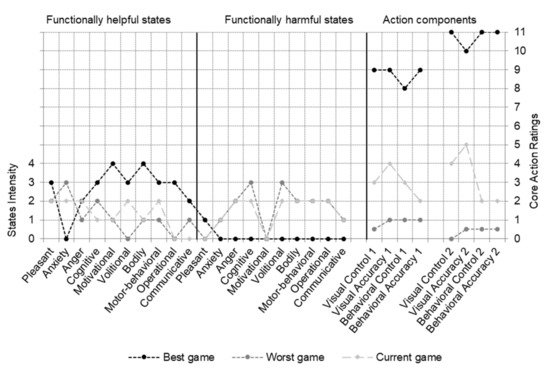Three cases had missing data (missingness > 5%), and were thus deleted. An individual profile including ratings for the self-selected core action elements and intensities of feeling states is depicted in Figure 1. Descriptive statistics for core action elements and feeling states identified in recalled best and worst games at group level is presented in Table 1.