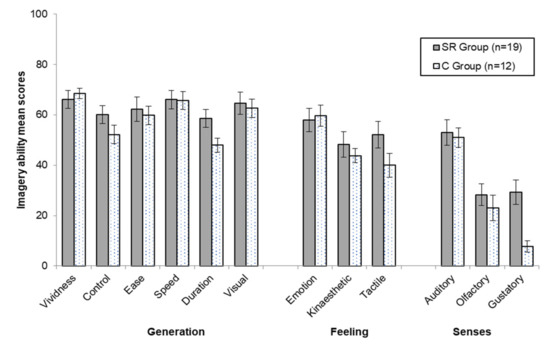 Participants’ mean scores in the imagery ability subscales at phase one (pre-intervention) are depicted in Figure 2. There were no significant differences in the imagery ability subscale scores across SR and C group players, Wilks’ λ = 0.483, F(12, 18) = 1.604, p = 0.107, ηp2 = 0.517. Their imagery ability was deemed sufficient to follow the study protocols.