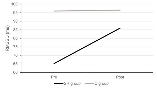 Repeated measures MANOVAs yielded significant differences by group for RMSSD mean scores recorded during sleep at pre- and post-training assessments, Wilks’ λ = 0.542, F(2, 15) = 6.345, p = 0.010, ηp2 = 0.458. Post hoc analysis indicated significant differences in the RMSSD values prior to the commencement of the training program, with a significant increase in variability for SR participants (see also Figure 3).