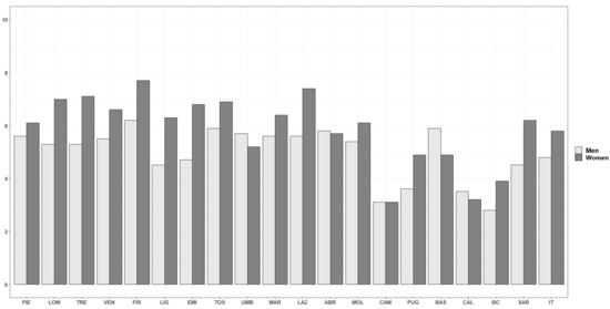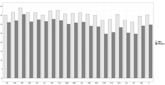 In 2018, the AAI scored 32.4 for Italy as a whole. The overall value (i.e., for both genders combined) ranged from 27.9 in Sicily to 37.2 in Trentino-Alto Adige, thus, confirming the existence of significant regional disparities. Indeed, the AAI showed a clear geographical pattern: the values were much lower in the islands and in the southern regions than in the northern and central ones (Figure 1). A similar situation is also found when looking at the breakdowns of AAI by sex (Figure 2): in 2018, Trentino-Alto Adige recorded the highest AAI scores for both men (39.1) and women (35.5), while Sicily recorded the lowest (31.3 for men, and 24.6 for women).