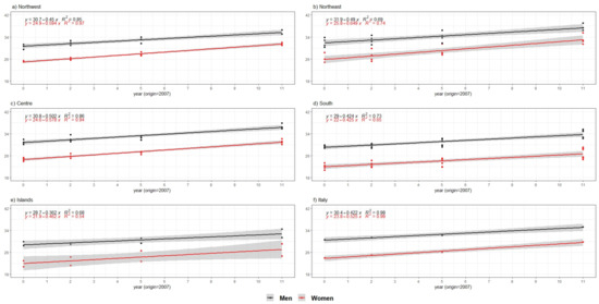 AAI trend by macro-region and sex over the 2007–2018 period. Source: Authors’ calculations based on numerous data sources from ISTAT. Note: (a) Northwest includes Piedmont, Aosta Valley, Liguria, Lombardy; (b) Northeast includes Trentino-Alto Adige, Veneto, Friuli-Venezia Giulia, Emilia-Romagna; (c) Centre includes Tuscany, Umbria, Marche, Latium; (d) South includes Abruzzo, Molise, Campania, Apulia, Basilicata, Calabria; (e) Islands include Sicily, Sardinia; (f) Italy.