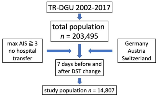 Inclusion criteria; max = maximum; AIS = abbreviated injury score; DST daylight saving time.
