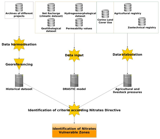 The methodology developed draws its origin from the request by the Puglia Region Authority compared to the CNR-IRSA to review the perimeter of the NVZs of the previous four-year period (2012–2015), which were identified only based on the measured values of nitrates in the underground wells monitored.