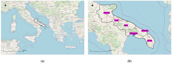 Study area: (a) Puglia region (black line); (b) the six provinces of the Puglia region: Foggia, B.A.T., Bari, Taranto, Brindisi, and Lecce (violet labels). Base map from © OpenStreetMap contributors.