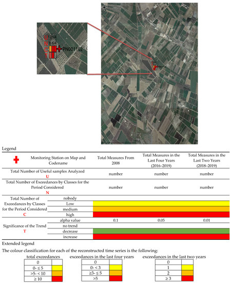 Georeferencing of data and production of synthetic thematic maps for immediate understanding of the status of a monitoring station. In this picture, a groundwater monitoring well is shown (PN001102); it results in a total of 12 (from 2008 to date), 6 (for annuality 2016–2019), and 4 (for annuality 2018–2019) samples analysed, with 8, 6, and 4 exceedances referred to the same periods. The total number of exceedances have been classified and coloured with the value reported in the extended legend. In detail, the exceedances are medium (n. 8 and color orange) for the period from 2008 to date, high (n. 6 and color red) for the period 2016–2019, and high (n. 4 and color red) for the period 2018–2019.