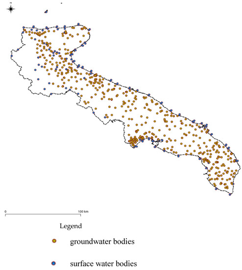 The first step of the methodology workflow consisted of the integration of data acquired in several previous projects and monitoring campaigns carried out in the past [24,25]. The total dataset comprises 231 underground water bodies monitoring stations (79 of phreatic type and 152 confined) monitored every six months, and 143 surface water bodies (38 rivers, 6 lakes, 15 transitional waters, and 84 coastal marines) investigated every three months. The data were harmonised by transforming the values with the same unit of measurement and linking them to the acquisition date and the coordinates of the position. By doing so, the data were georeferenced and reported in a Geographic Information System (GIS) system, making it possible to derive the temporal variations with time-series analyses.