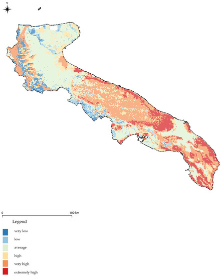 Therefore, the vulnerability estimated for the aquifers of the Puglia Region was made using a standardised system for evaluating groundwater pollution potential using local hydrogeological settings, the DRASTIC method [35]. The modelling application was implemented based on the reworking of the geo-lithological map drawn up by the Basin Authority of the Puglia Region [36] and the acquisition of meteorological data for the period 1950–2013 provided by the Regional Civil Protection Section [37], as well as the period 2008–2018 by the Agrometeorological Service or Puglia Region [38].