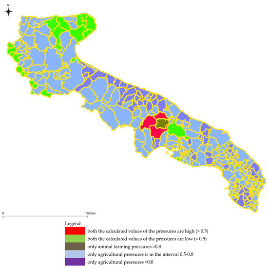 Pressures on water bodies related to agriculture and animal farming were considered just in aggregate form at the municipal level, as the available data are not georeferenced, i.e., the detailed company information is not related to geographical coordinates but only to the name of the municipality to which the company belongs.