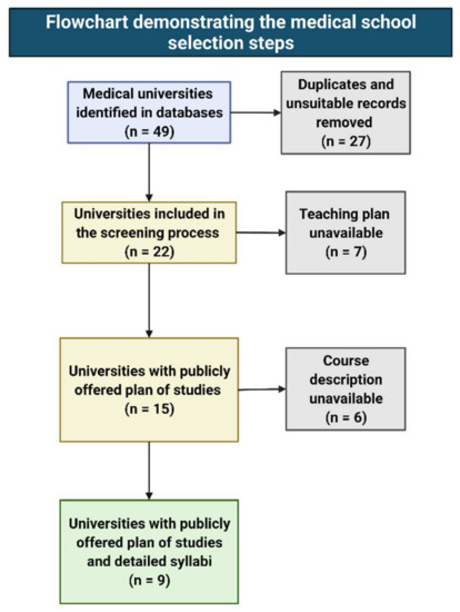 Using the internet addresses, we visited the home pages of each university and performed a manual search for the study plan and course description in the form of a syllabus (Figure 1). Of the initially included 22 medical schools, 15 provided public information on the study program, and 9 delivered publicly available syllabi.